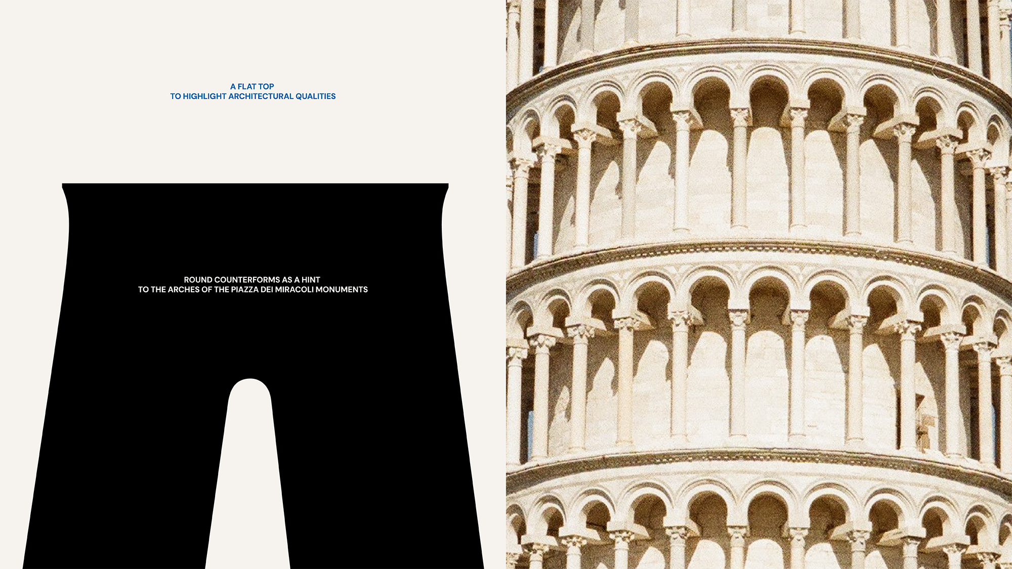 The club’s custom font was inspired by the proportions and rhythm of its city’s architecture — echoing the cathedral’s arches and the Leaning Tower’s geometry.